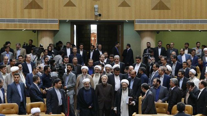 در همین جلسه صادق لاریجانی، رئیس قوه قضاییه گفت در حالی که دولت آمریکا به دنبال تغییر حکومت ایران است "عدهای در داخل برای دوستی با آنها دست دراز میکنند" و خطر "نفوذ" جمهوری اسلامی را تهدید میکند.